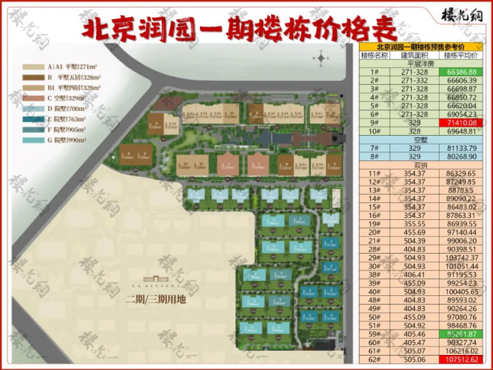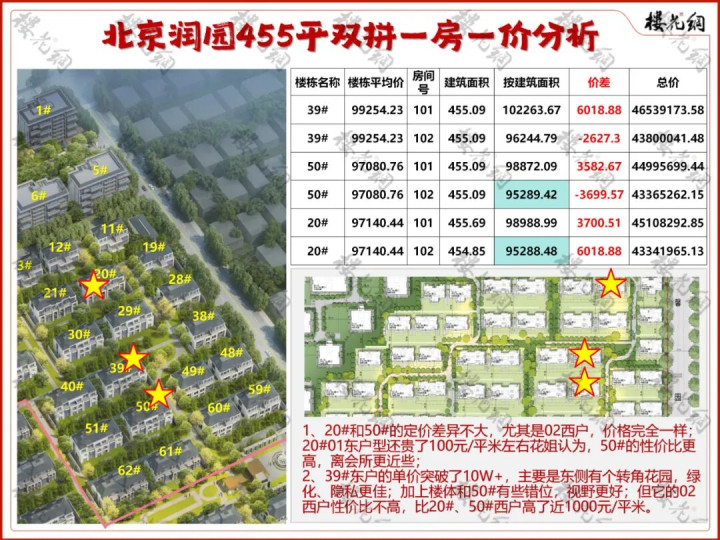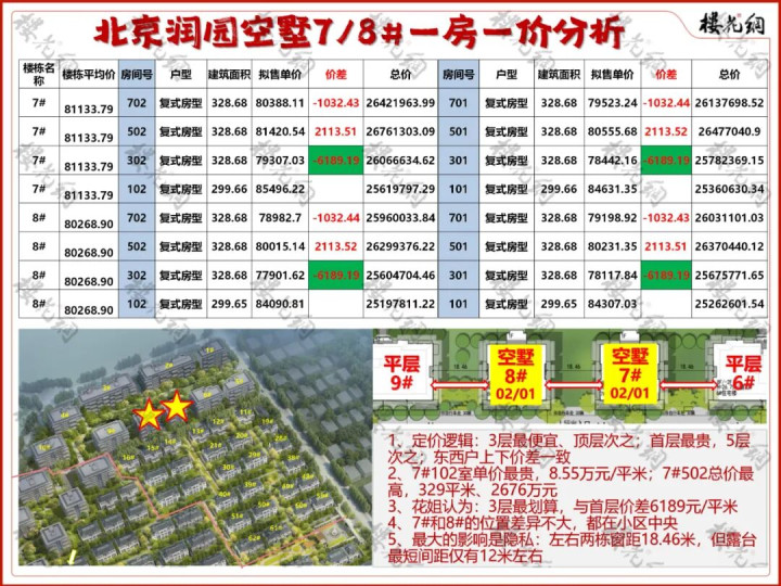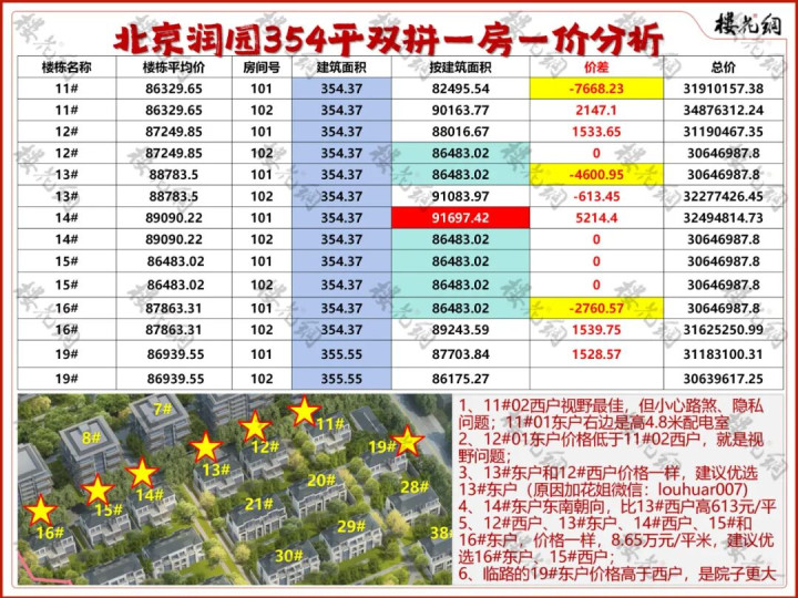 4、拿30#、40#和51#的西户对比,30#比40#高850元/平米,大概是因为入户在北,院子更完整、且西南侧景观更好;51#价格比30#、40#稍逊,主要是西侧景观弱些。