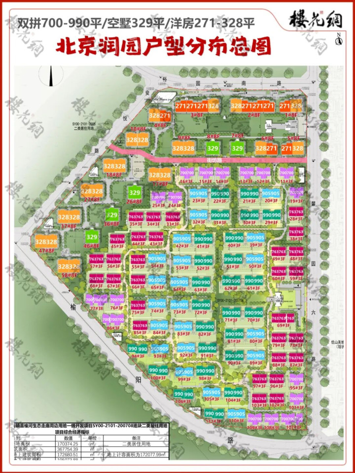 共规划111栋住宅楼,483户:19栋8层洋房、92栋双拼别墅。一条东西走向的街坊路和西侧的景观绿化带,将洋房与别墅之间区隔开来,彼此独立。