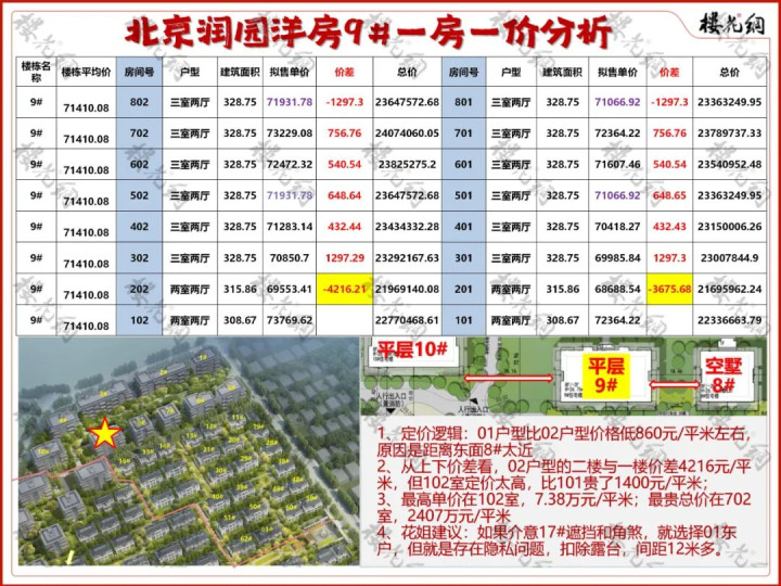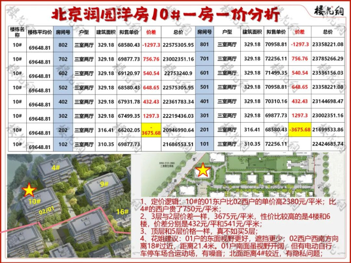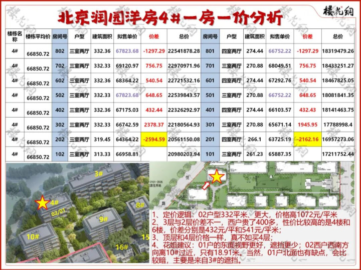 1、定价逻辑:10#的01东户比02西户单价高2380元/平米,比4#的西户高750元/平米;
