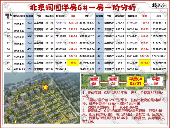 1、平墅的定价逻辑,四层和六层的性价比较高,五层和顶层的定价大致相同,建议优先选择四至六层;