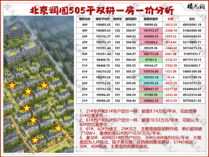 2、61#西户和62#东户定价一样,都是10.53万元/平米,花姐认为62#的位置更优;