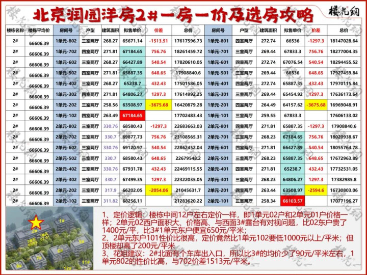 3、花姐建议:2#北面有个车库出入口,所以比3#的均价少了90元/平米左右,1单元802的性价比高,与702价差1513元/平米。