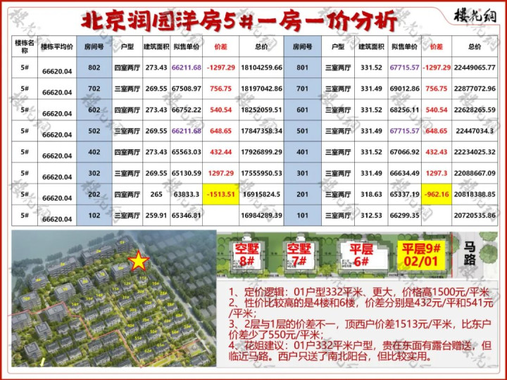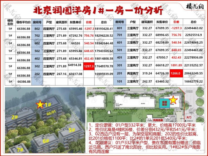 1、定价逻辑:02户型332平米,01户型为260-273平,前者比后者价格高3234元/平米;