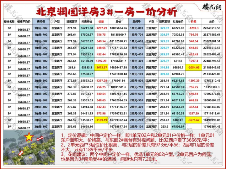 3、花姐建议:两个中间户定价一样,优选1单元的02户型。2单元西户为何低,也是因为3#南角受4#的遮挡,间距也只有7.26米。